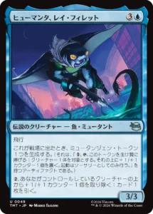 《ヒューマンタ、レイ・フィレット》は、4マナ3/3の飛行クリーチャーで、出たときにミュータンジェンを生成します。ということは、ミュータンジェン込みで5マナ4/4の飛行クリーチャーになるわけです。これも、「最初はパワー3だけど、1つ手間をかけてパワー4になる」という意味で、パワー4の基本形と言えます。