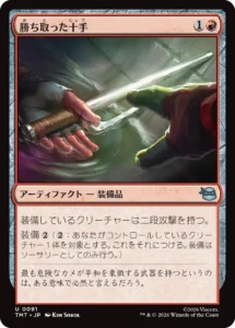 《シュレッダーの甲冑》は再装備コストが重いものの、1回限りと割り切るのであれば、軽いコストで即座に装備できる点が優秀です。《勝ち取った十手》は、パワー2のクリーチャーに二段攻撃付与で実質パワー4。装備コストも軽く扱いやすいです。